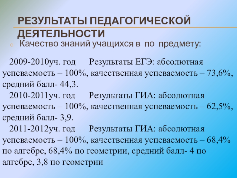 РЕЗУЛЬТАТЫ ПЕДАГОГИЧЕСКОЙ ДЕЯТЕЛЬНОСТИКачество знаний учащихся в по предмету:  2009-2010уч. год   Результаты ЕГЭ: абсолютная успеваемость