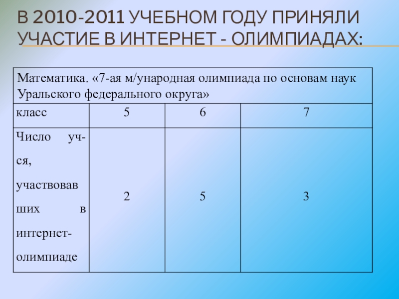 Слайд 10В 2010-2011 УЧЕБНОМ ГОДУ ПРИНЯЛИ УЧАСТИЕ В ИНТЕРНЕТ - ОЛИМПИАДАХ: