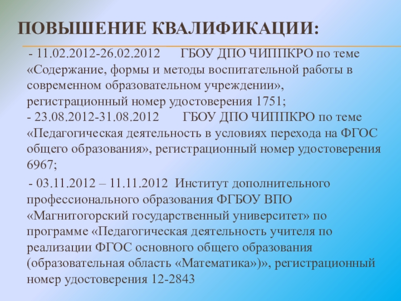 - 03.11.2012 – 11.11.2012 Институт дополнительного профессионального образования ФГБОУ ВПО «Магнитогорский государственный университет» по программе «Педагогическая деятельность учителя по реализации ФГОС основного общего образования (образовательная область «Математика»)», регистрационный номер удостоверения 12-2843