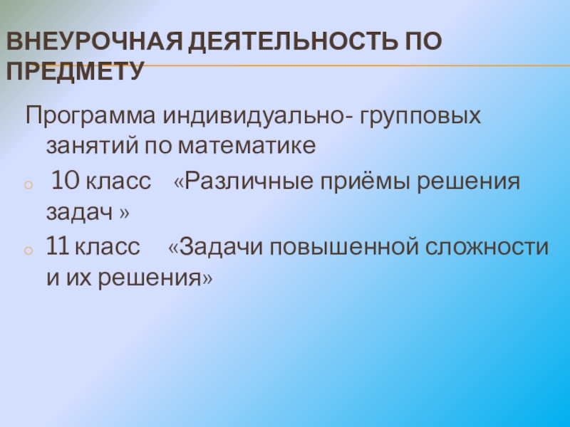 ВНЕУРОЧНАЯ ДЕЯТЕЛЬНОСТЬ ПО ПРЕДМЕТУПрограмма индивидуально- групповых занятий по математике 10 класс  «Различные приёмы решения задач »11