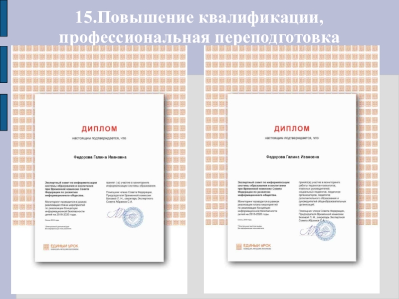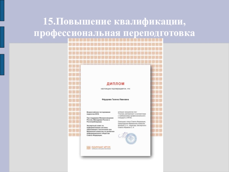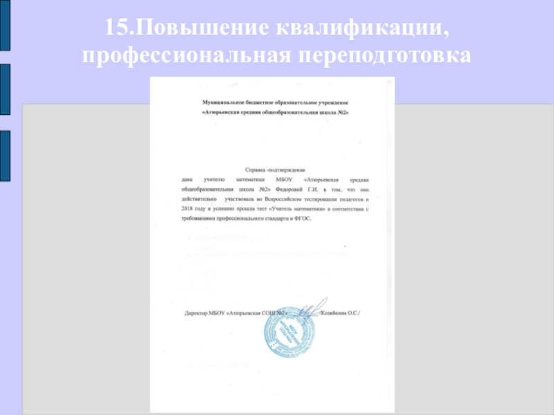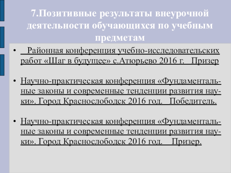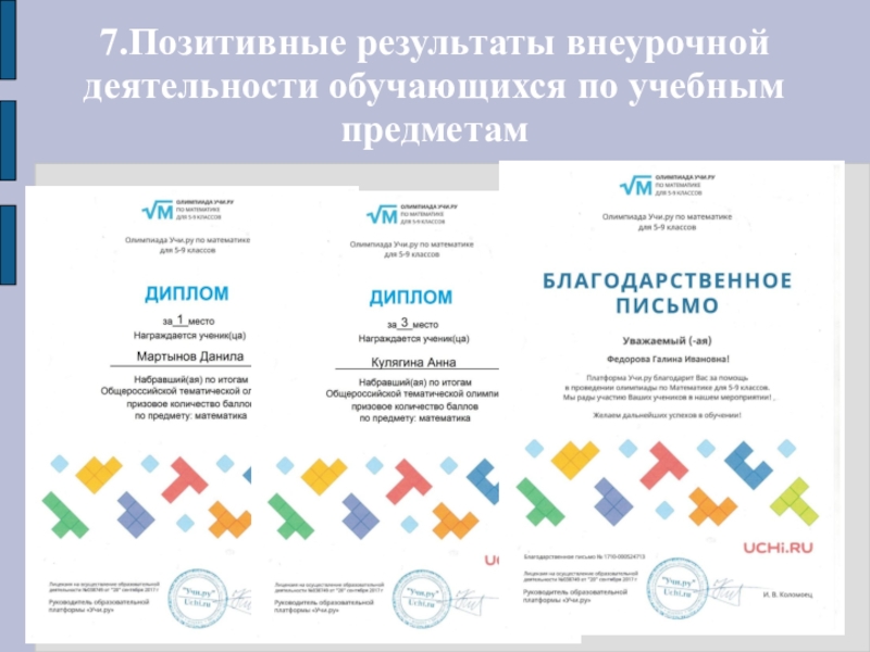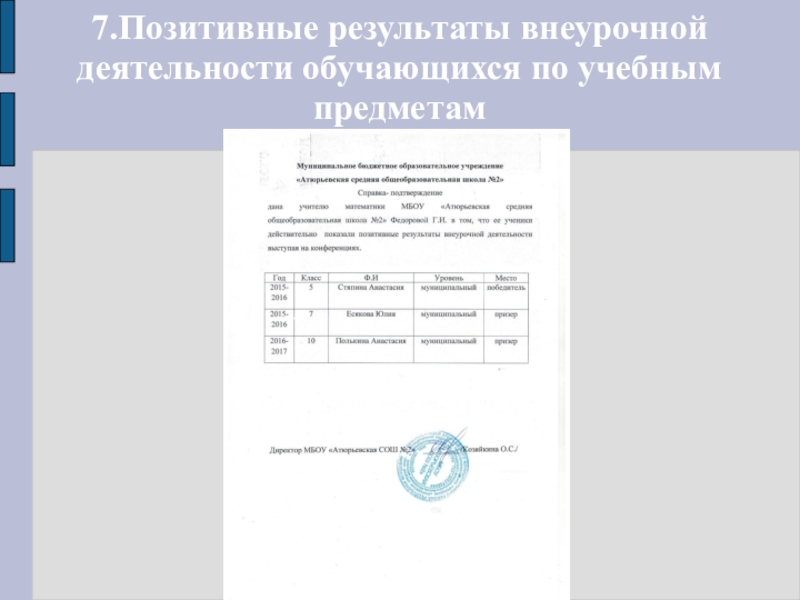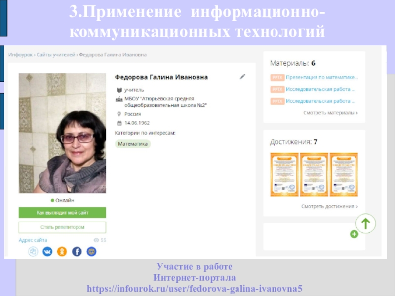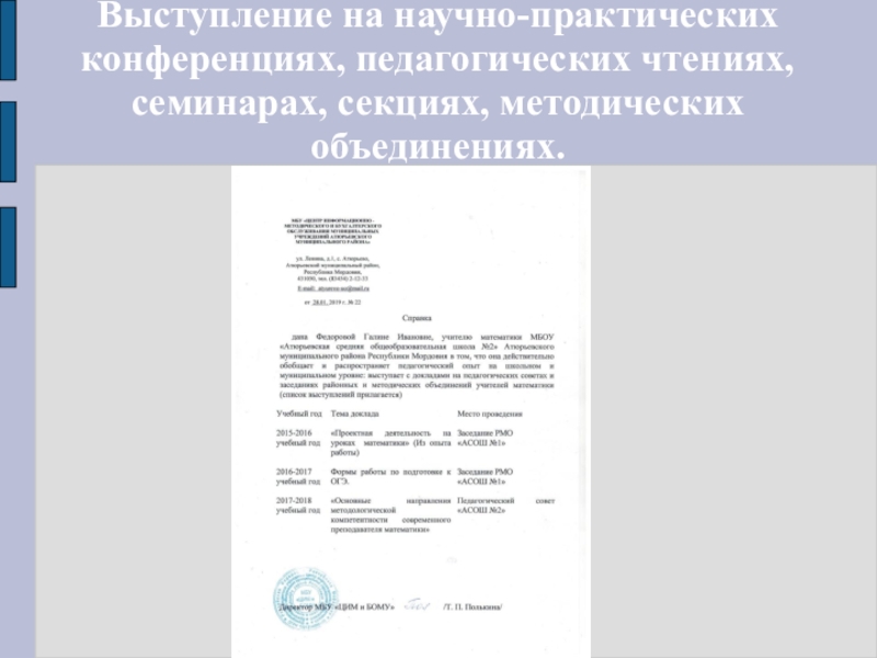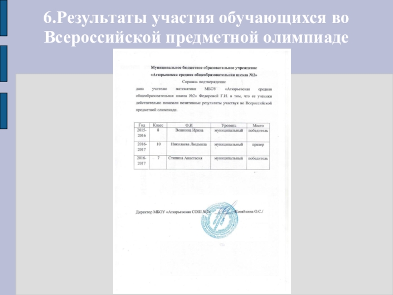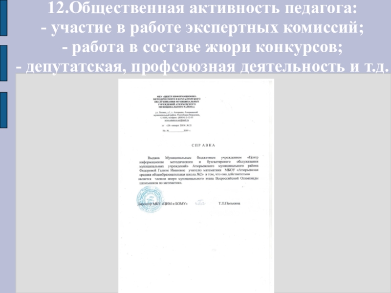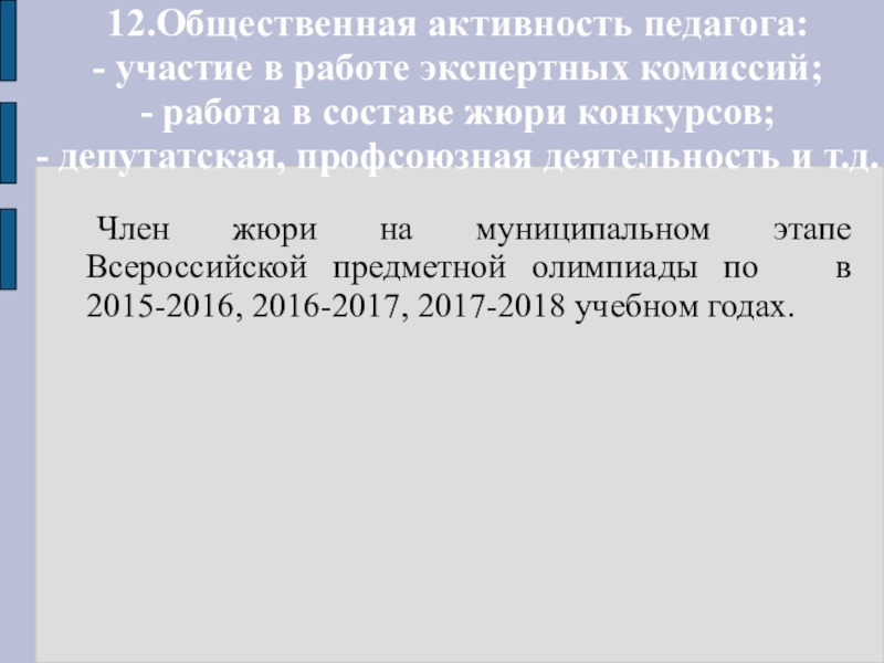 Член жюри на муниципальном этапе Всероссийской предметной олимпиады по в 2015-2016, 2016-2017, 2017-2018 учебном годах.