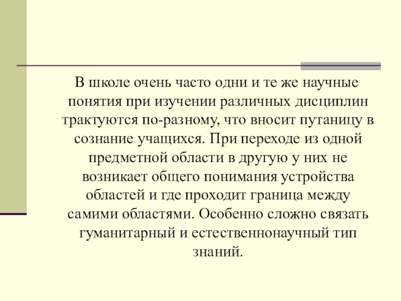 понятия при изучении различных дисциплин трактуются по-разному, что вносит путаницу в сознание учащихся. При переходе из одной предметной области в другую у них не возникает общего понимания устройства областей и где проходит граница между самими областями. Особенно сложно связать гуманитарный и естественнонаучный тип знаний.