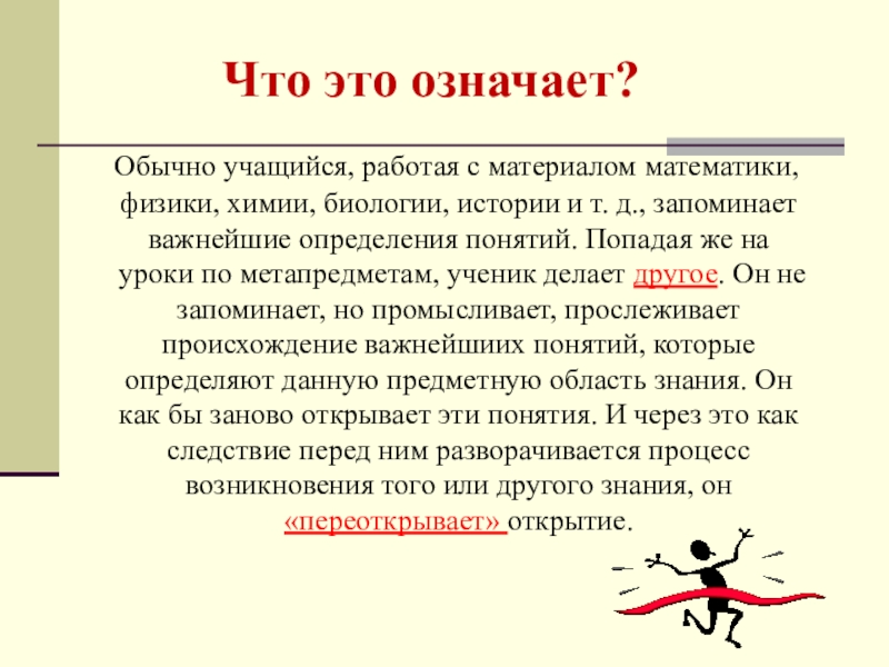 химии, биологии, истории и т. д., запоминает важнейшие определения понятий. Попадая же на уроки по метапредметам, ученик делает другое. Он не запоминает, но промысливает, прослеживает происхождение важнейшиих понятий, которые определяют данную предметную область знания. Он как бы заново открывает эти понятия. И через это как следствие перед ним разворачивается процесс возникновения того или другого знания, он «переоткрывает» открытие.