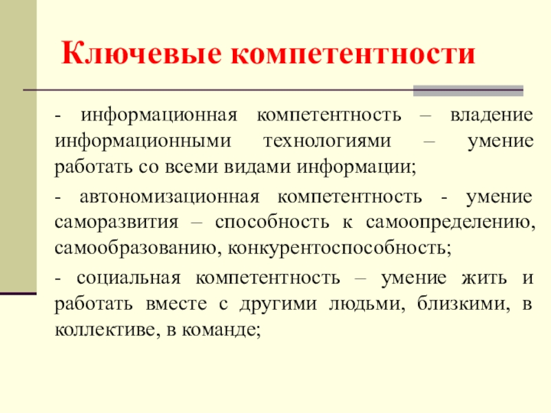 - автономизационная компетентность - умение саморазвития – способность к самоопределению, самообразованию, конкурентоспособность;
