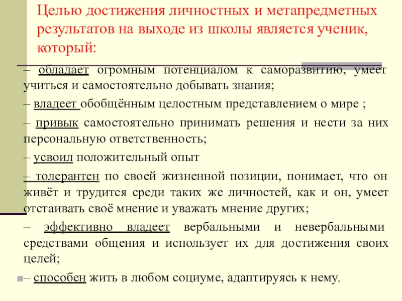 Слайд 40Целью достижения личностных и метапредметных результатов на выходе из школы является