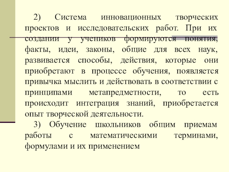 Слайд 182) Система инновационных творческих проектов и исследовательских работ. При их создании