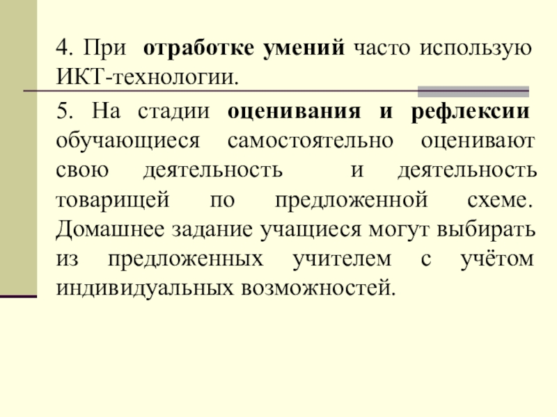 3. При изучении нового материала использую приемы педагогической техники, которые обеспечивают развитие у обучающихся навыков работы с различными источниками информации (учебник, справочники, дополнительные материалы, Интернет). Учащиеся осуществляют учебные действия по намеченному плану (применяются групповая и индивидуальная форма организации деятельности).