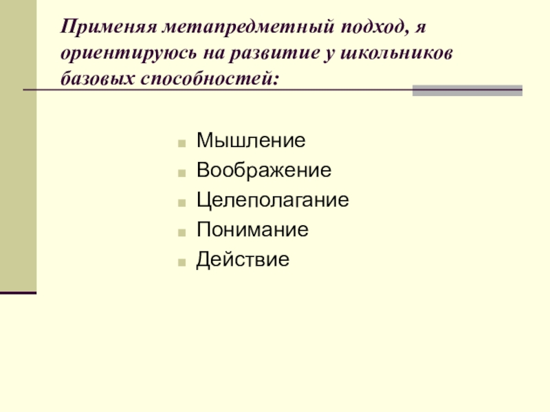 Слайд 47Применяя метапредметный подход, я ориентируюсь на развитие у школьников базовых способностей: