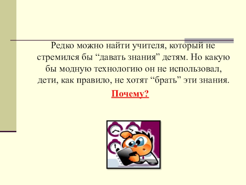 знания” детям. Но какую бы модную технологию он не использовал, дети, как правило, не хотят “брать” эти знания.
