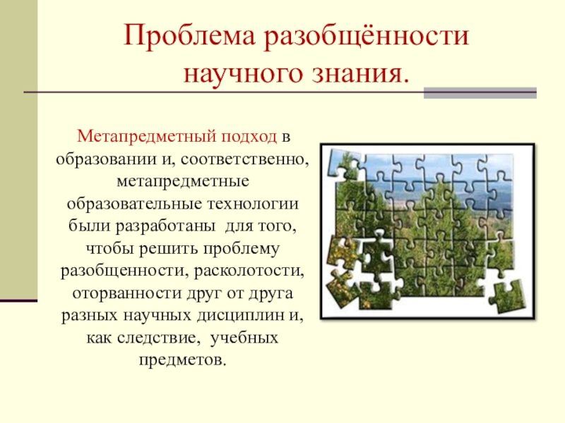в образовании и, соответственно, метапредметные образовательные технологии были разработаны для того, чтобы решить проблему разобщенности, расколотости, оторванности друг от друга разных научных дисциплин и, как следствие, учебных предметов.