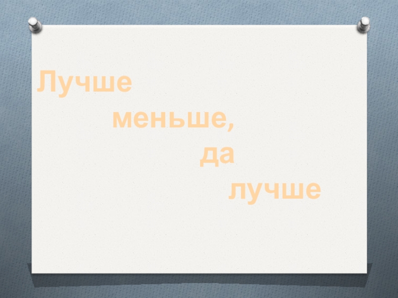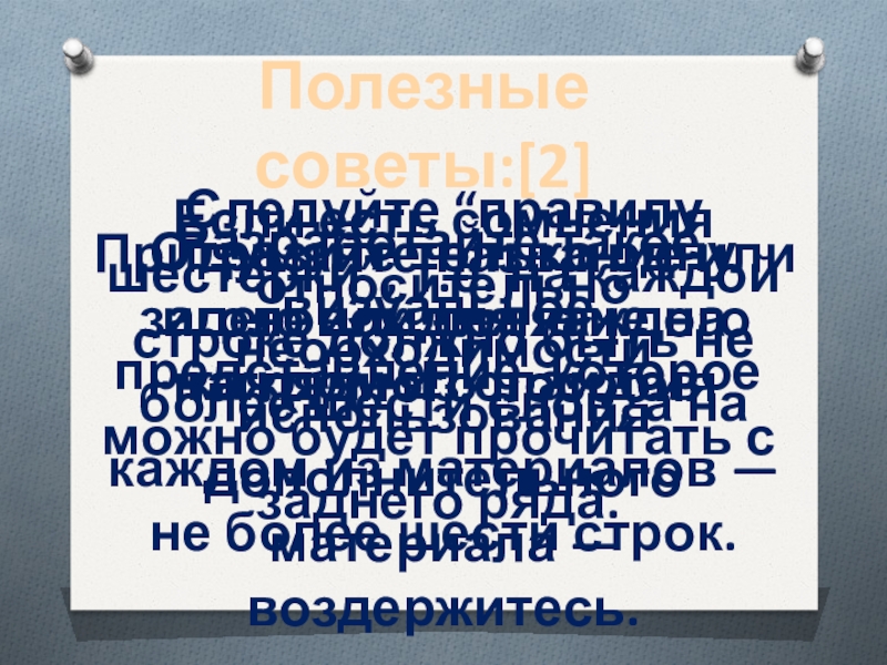 Следуйте “правилу шестерки”, т.е. на каждой строке должно быть не более шести слов, а на каждом из материалов — не более шести строк.