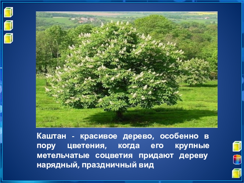 Слайд 20Каштан - красивое дерево, особенно в пору цветения, когда его крупные
