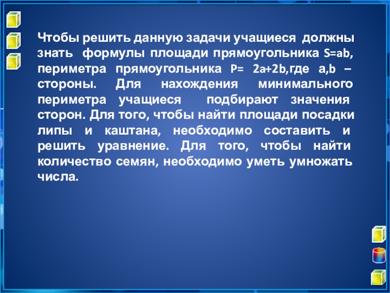 периметра прямоугольника P= 2a+2b,где а,b – стороны. Для нахождения минимального периметра учащиеся подбирают значения сторон. Для того, чтобы найти площади посадки липы и каштана, необходимо составить и решить уравнение. Для того, чтобы найти количество семян, необходимо уметь умножать числа.