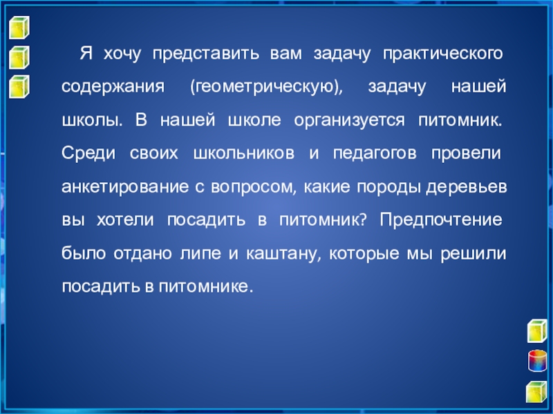 Слайд 18 Я хочу представить вам задачу практического содержания (геометрическую), задачу нашей