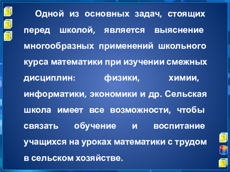 школьного курса математики при изучении смежных дисциплин: физики, химии, информатики, экономики и др. Сельская школа имеет все возможности, чтобы связать обучение и воспитание учащихся на уроках математики с трудом в сельском хозяйстве.