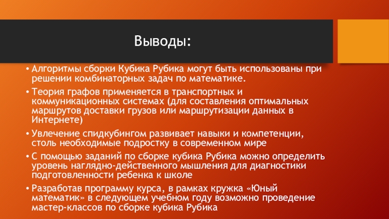 Разработав программу курса, в рамках кружка «Юный математик» в следующем учебном году возможно проведение мастер-классов по сборке кубика Рубика
