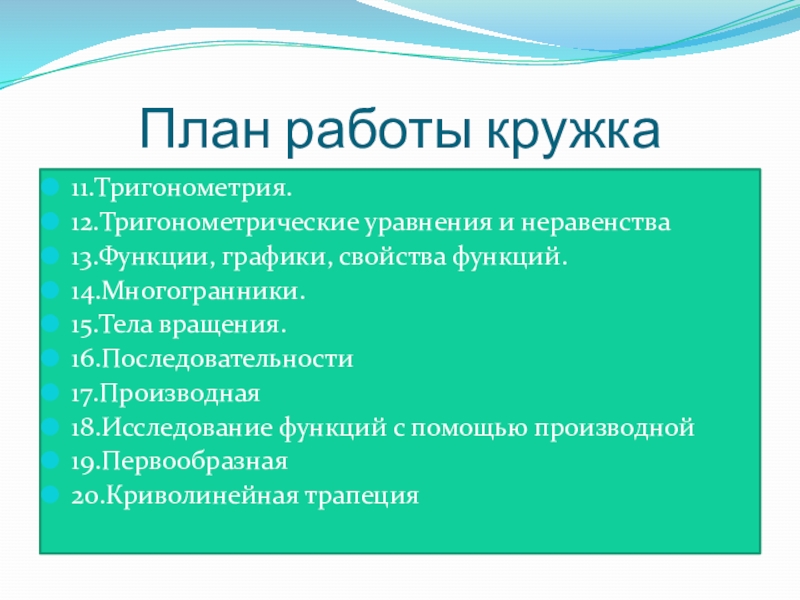 План работы кружка11.Тригонометрия.12.Тригонометрические уравнения и неравенства13.Функции, графики, свойства функций.14.Многогранники.15.Тела вращения.16.Последовательности17.Производная18.Исследование функций с помощью производной19.Первообразная20.Криволинейная трапеция
