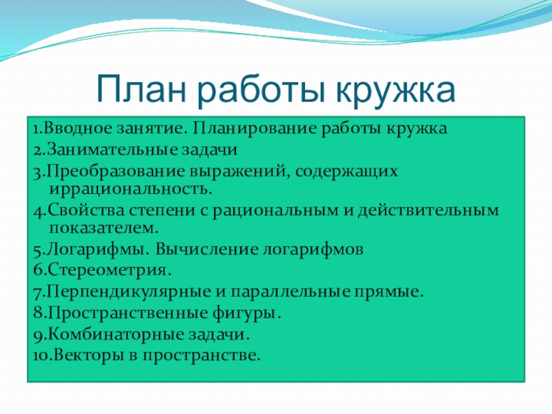 План работы кружка1.Вводное занятие. Планирование работы кружка2.Занимательные задачи3.Преобразование выражений, содержащих иррациональность.4.Свойства степени с рациональным и действительным показателем.5.Логарифмы.