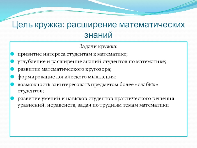 Цель кружка: расширение математических знанийЗадачи кружка:привитие интереса студентам к математике;углубление и расширение знаний студентов по математике;развитие математического кругозора;формирование логического мышления:возможность заинтересовать предметом более «слабых» студентов;развитие умений и навыков студентов практического решения уравнений, неравенств, задач по трудным