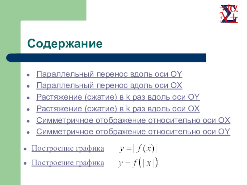 Параллельный перенос вдоль оси OYПараллельный перенос вдоль оси OXРастяжение (сжатие) в k раз вдоль оси OYРастяжение (сжатие) в k раз вдоль оси OXСимметричное отображение относительно оси OXСимметричное отображение относительно оси OYСодержание