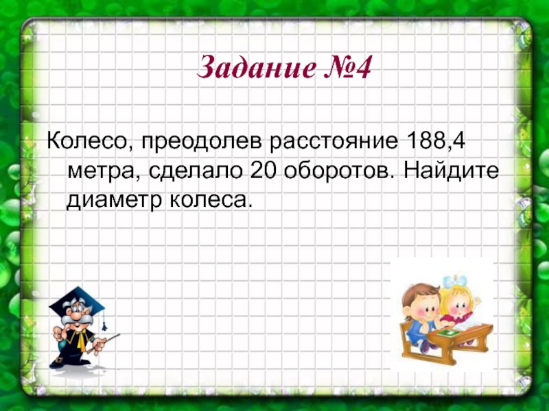 Колесо, преодолев расстояние 188,4 метра, сделало 20 оборотов. Найдите диаметр