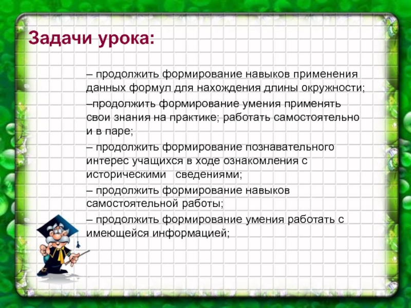 – продолжить формирование навыков применения данных формул для нахождения длины