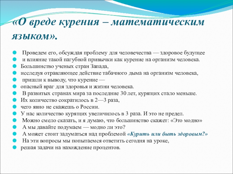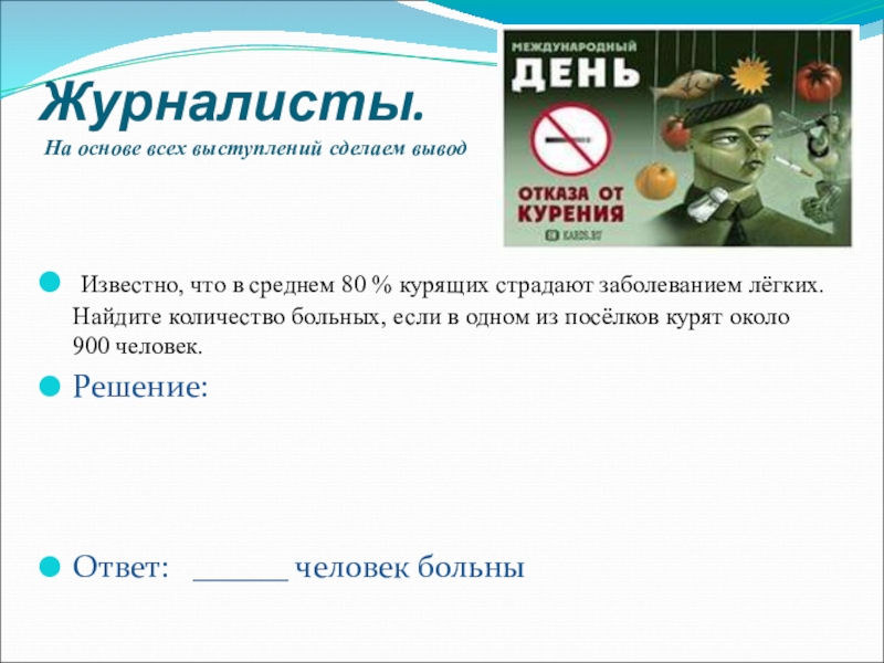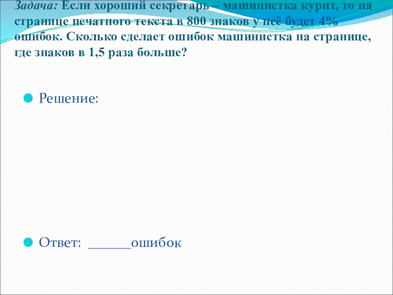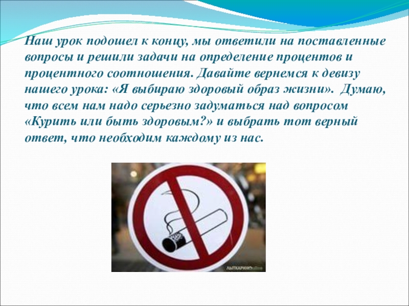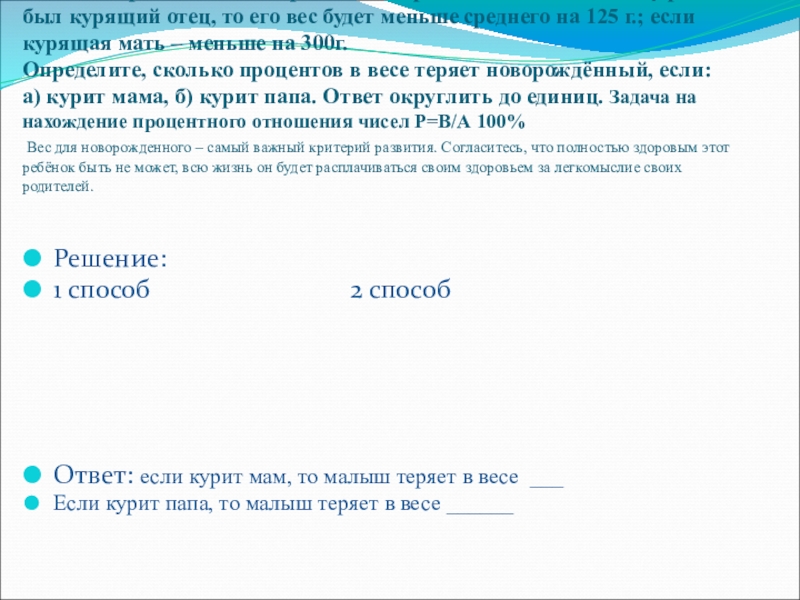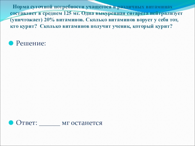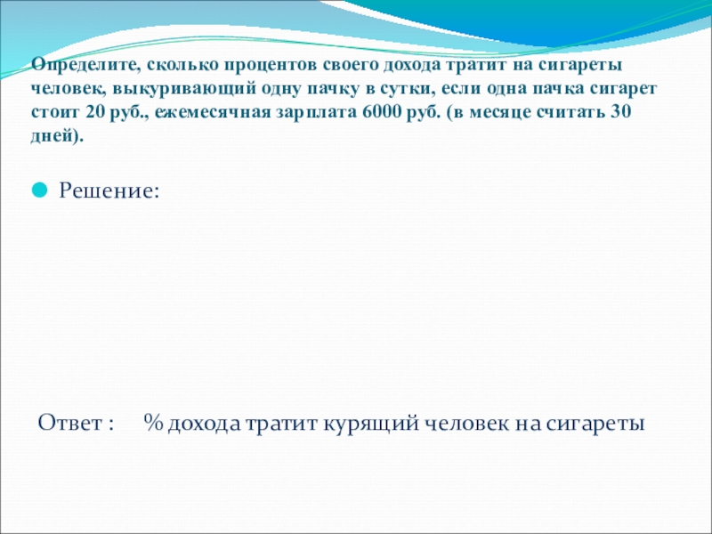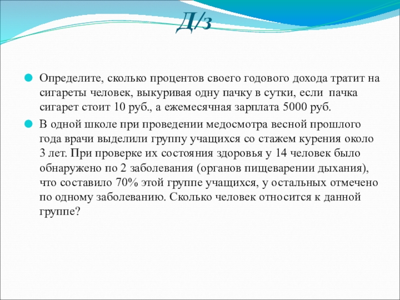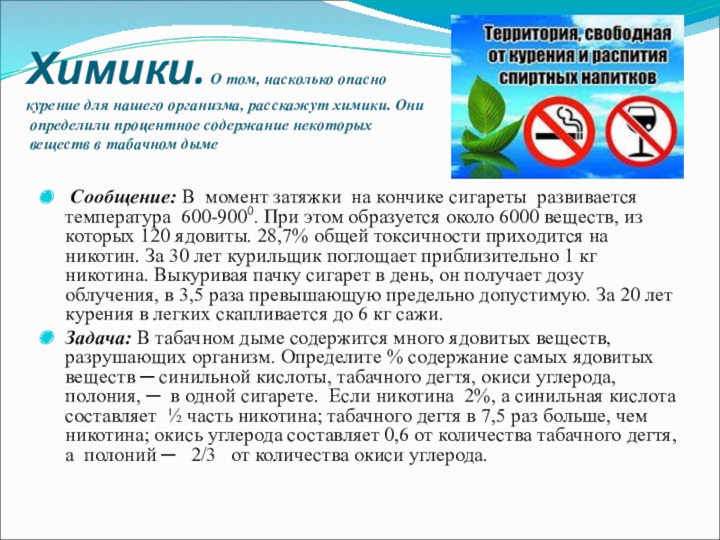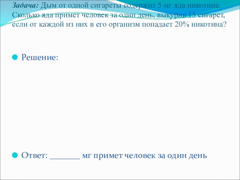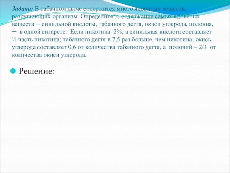 Задача: В табачном дыме содержится много ядовитых веществ, разрушающих организм. Определите % содержание самых ядовитых веществ ─ синильной кислоты, табачного дегтя, окиси углерода, полония, ─ в одной сигарете. Если никотина 2%, а синильная кислота составляет ½ часть никотина; табачного дегтя в 7,5 раз больше, чем никотина; окись углерода составляет 0,6 от количества табачного дегтя, а полоний ─ 2/3 от количества окиси углерода.