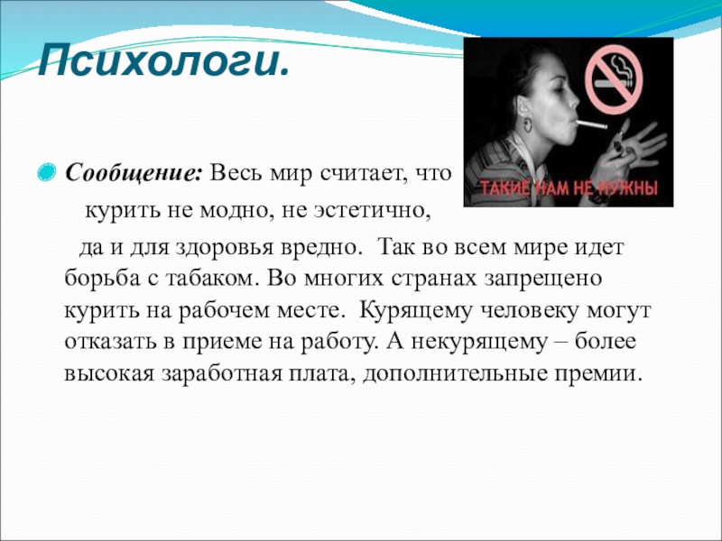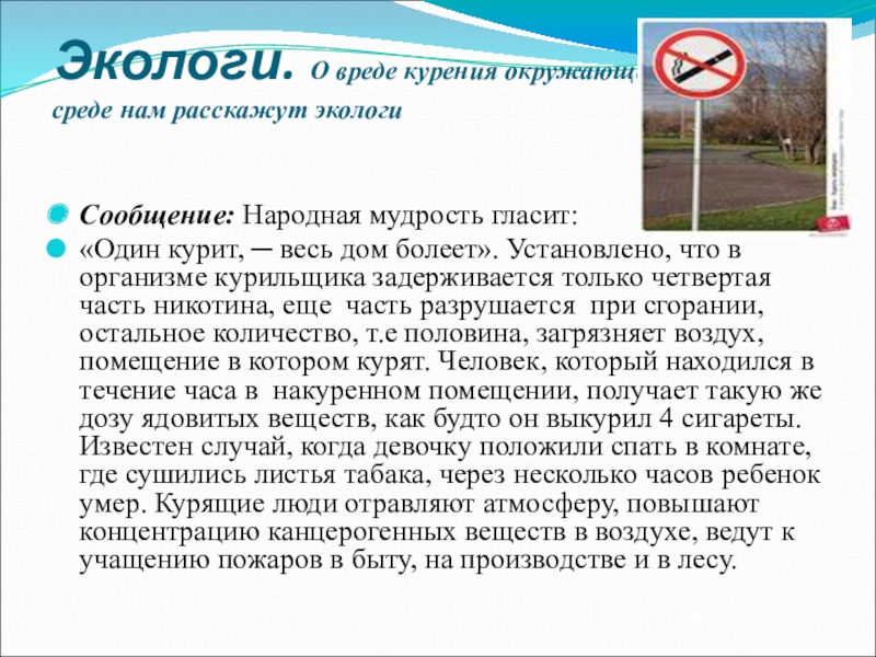 Сообщение: В момент затяжки на кончике сигареты развивается температура 600-9000. При этом образуется около 6000 веществ, из которых 120 ядовиты. 28,7% общей токсичности приходится на никотин. За 30 лет курильщик поглощает приблизительно 1 кг никотина. Выкуривая пачку сигарет в день, он получает дозу облучения, в 3,5 раза превышающую предельно допустимую. За 20 лет курения в легких скапливается до 6 кг сажи.