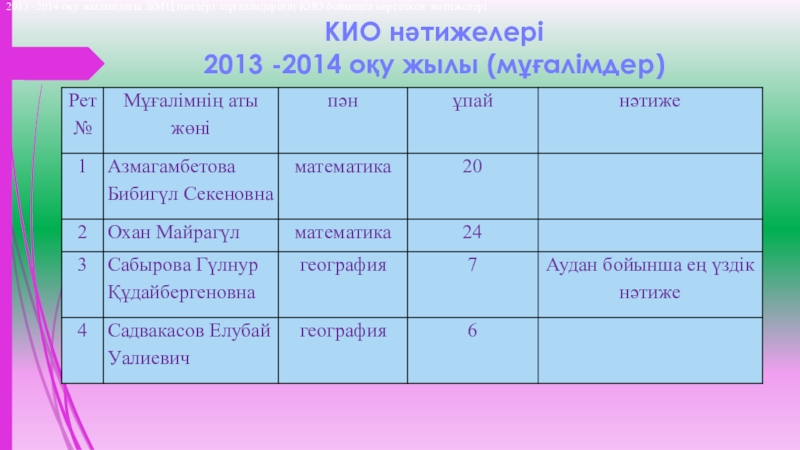 Слайд 112013 -2014 оқу жылындағы ЖМЦ пәндері мұғалімдерінің КИО бойынша көрсеткен нәтижелері