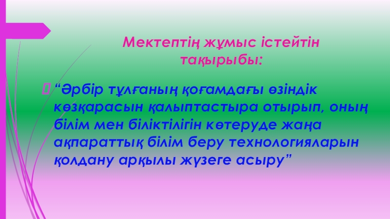 Мектептің жұмыс істейтін тақырыбы:“Әрбір тұлғаның қоғамдағы өзіндік көзқарасын қалыптастыра отырып, оның білім мен біліктілігін көтеруде жаңа ақпараттық
