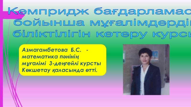 Кемпридж бағдарламасы бойынша мұғалімдердің біліктілігін көтеру курсыАзмагамбетова Б.С.  - математика пәнінің мұғалімі 3-деңгейлі курсты  Көкшетау