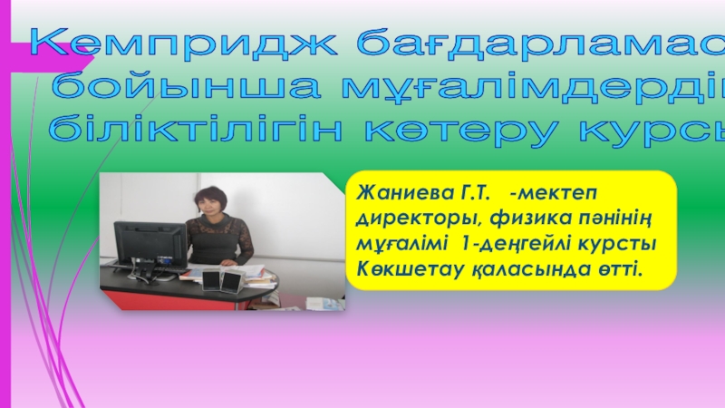 Кемпридж бағдарламасы бойынша мұғалімдердің біліктілігін көтеру курсыЖаниева Г.Т.  -мектеп директоры, физика пәнінің мұғалімі 1-деңгейлі курсты