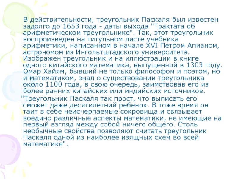 года - даты выхода "Трактата об арифметическом треугольнике". Так, этот треугольник воспроизведен на титульном листе учебника арифметики, написанном в начале XVI Петром Апианом, астрономом из Ингольтштадского университета. Изображен треугольник и на иллюстрации в книге одного китайского математика, выпущенной в 1303 году. Омар Хайям, бывший не только философом и поэтом, но и математиком, знал о существовании треугольника около 1100 года, в свою очередь, заимствовав его из более ранних китайских или индийских источников.