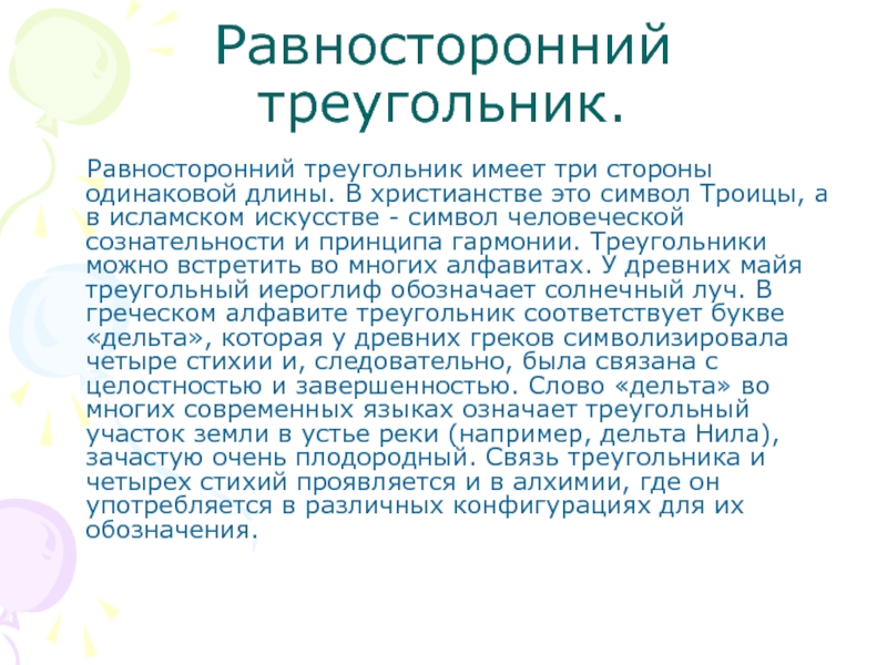 Равносторонний треугольник.  Равносторонний треугольник имеет три стороны одинаковой длины. В христианстве это символ Троицы, а в