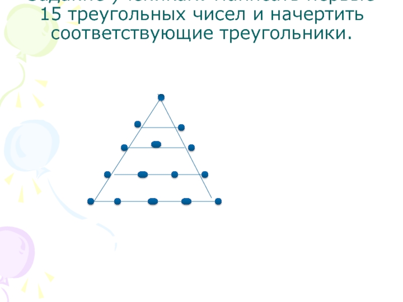 Слайд 4Задание ученикам. Написать первые 15 треугольных чисел и начертить соответствующие треугольники.