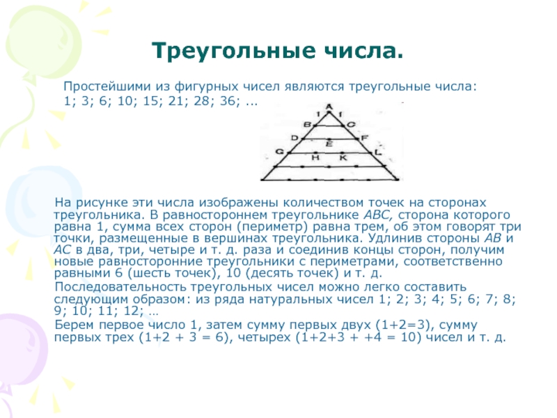 На рисунке эти числа изображены количеством точек на сторонах треугольника. В равностороннем треугольнике АВС, сторона которого равна 1, сумма всех сторон (периметр) равна трем, об этом говорят три точки, размещенные в вершинах треугольника. Удлинив стороны АВ и АС в два, три, четыре и т. д. раза и соединив концы сторон, получим новые равносторонние треугольники с периметрами, соответственно равными 6 (шесть точек), 10 (десять точек) и т. д.