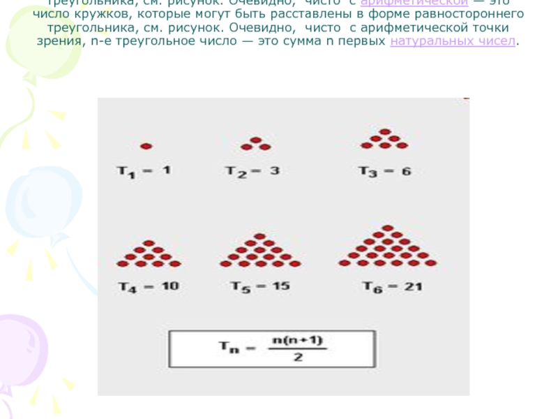 Треугольное число — это число — это число кружков, которые могут быть расставлены в форме равностороннего треугольника — это число кружков, которые могут быть расставлены в форме равностороннего треугольника, см. рисунок. Очевидно, чисто с арифметической — это число кружков, которые
