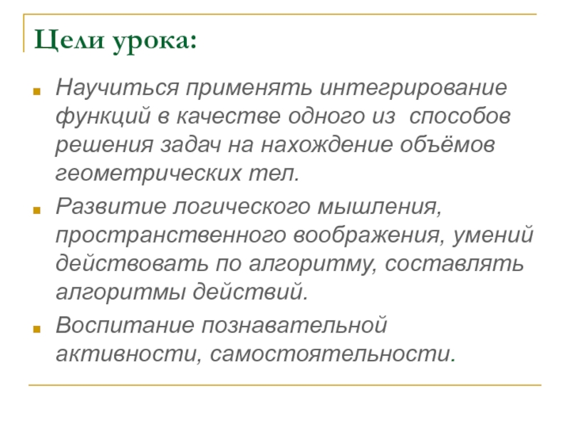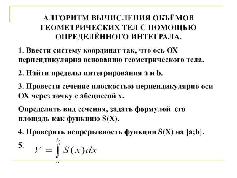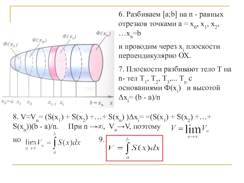 8. V≈Vn= (S(x1) + S(x2) +…+ S(xn) )Δxi= =(S(x1) + S(x2) +…+ S(xn))(b - a)/n. При n →∞, Vn→V, поэтому