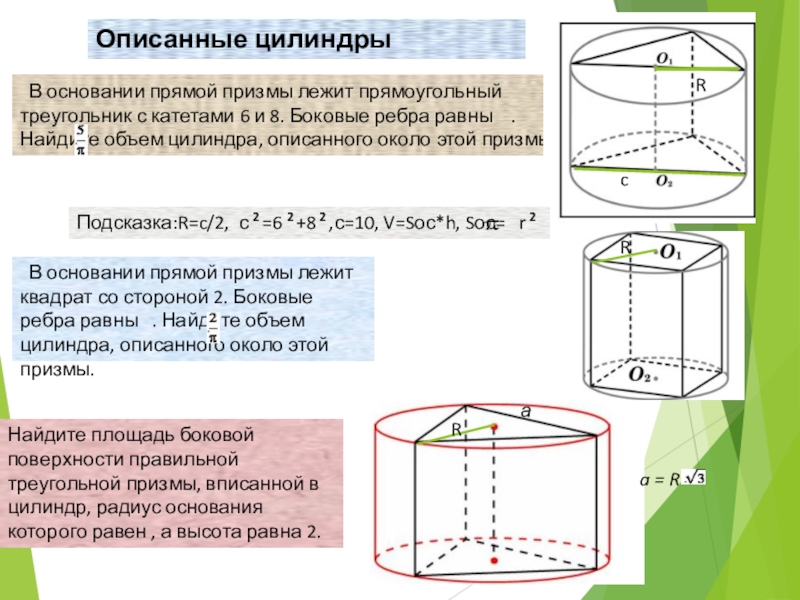 Подсказка:R=c/2, с 2 =6 2 +8 2 ,с=10, V=Sос*h, Sос= r 2