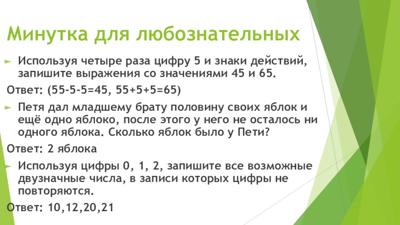Минутка для любознательныхИспользуя четыре раза цифру 5 и знаки действий, запишите выражения со значениями 45 и 65.Ответ: (55-5-5=45, 55+5+5=65)Петя дал младшему брату половину своих яблок и ещё одно яблоко, после этого у него не осталось ни