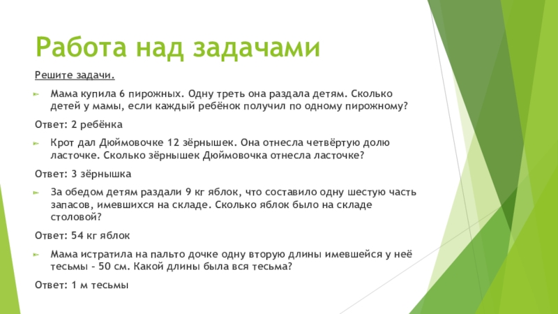Работа над задачамиРешите задачи.Мама купила 6 пирожных. Одну треть она раздала детям. Сколько детей у мамы, если