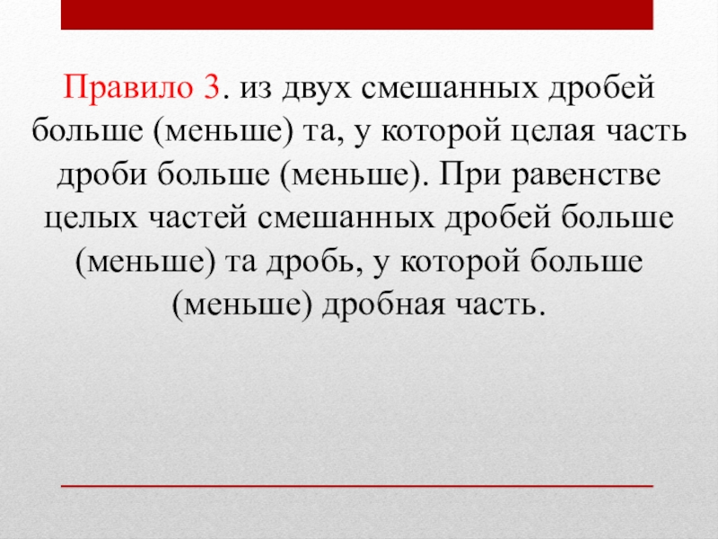 Слайд 11Правило 3. из двух смешанных дробей больше (меньше) та, у которой