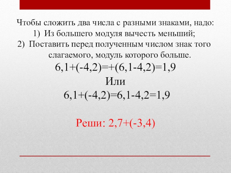 Слайд 37Чтобы сложить два числа с разными знаками, надо:
