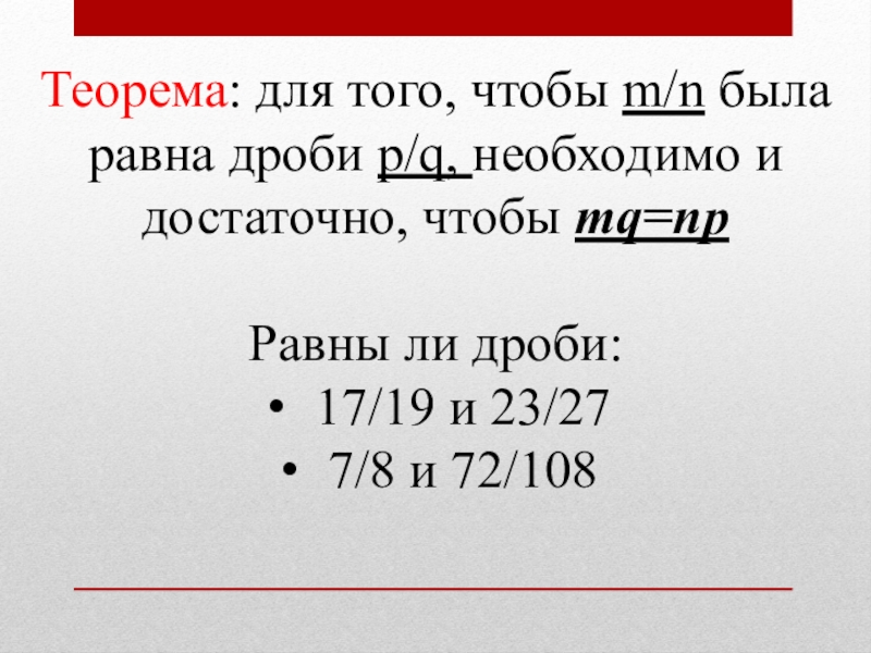 Слайд 6Теорема: для того, чтобы m/n была равна дроби p/q, необходимо и
