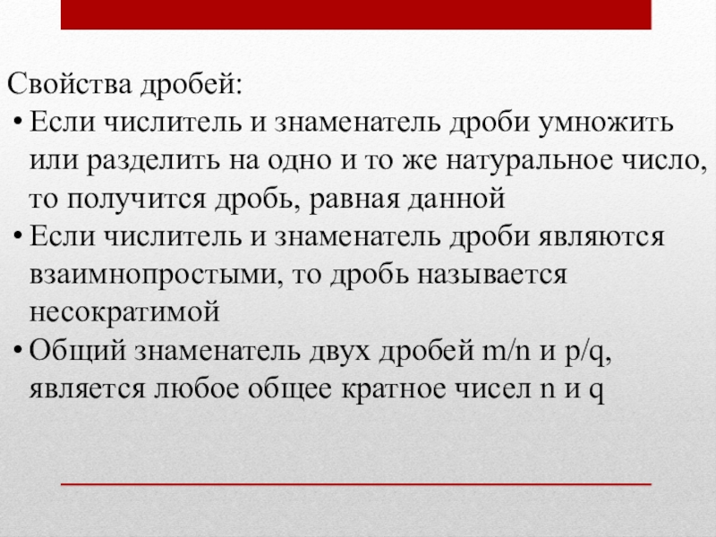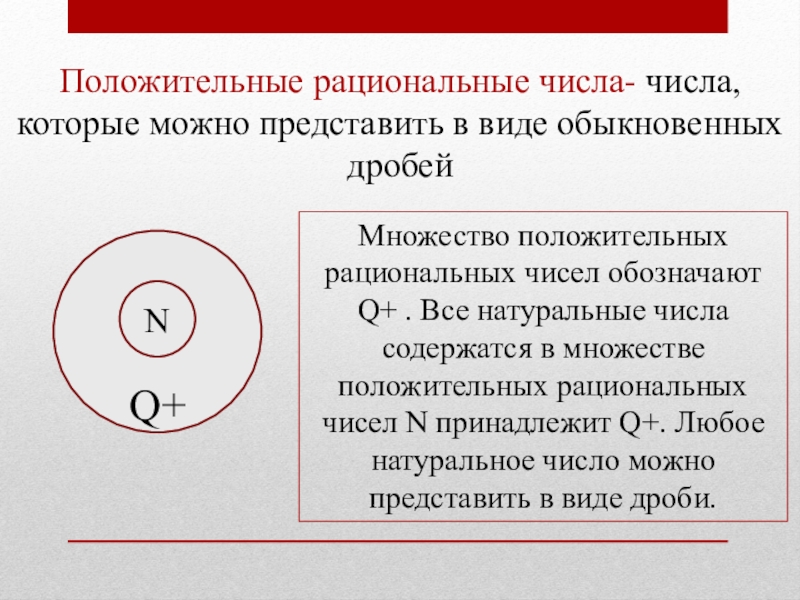 положительных рациональных чисел обозначают Q+ . Все натуральные числа содержатся в множестве положительных рациональных чисел N принадлежит Q+. Любое натуральное число можно представить в виде дроби.