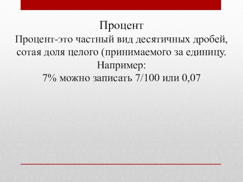 Процент-это частный вид десятичных дробей, сотая доля целого (принимаемого за единицу.