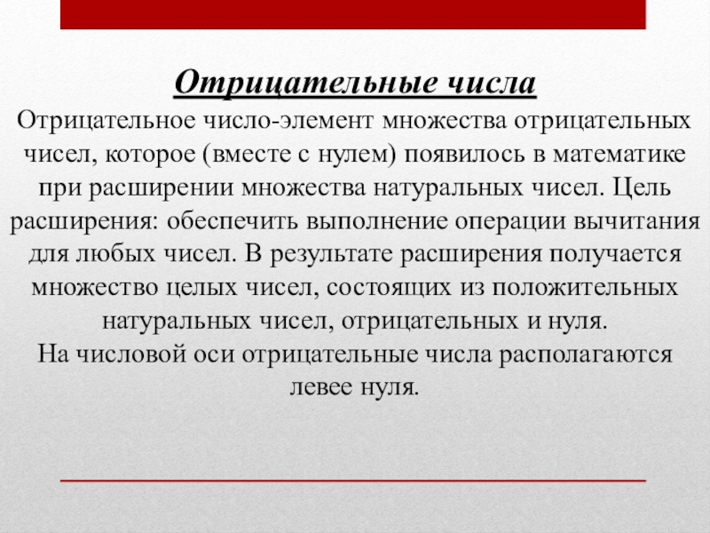 появилось в математике при расширении множества натуральных чисел. Цель расширения: обеспечить выполнение операции вычитания для любых чисел. В результате расширения получается множество целых чисел, состоящих из положительных натуральных чисел, отрицательных и нуля.