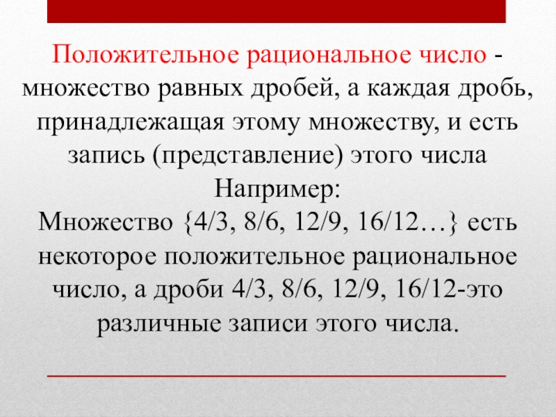 Слайд 13Положительное рациональное число - множество равных дробей, а каждая дробь, принадлежащая
