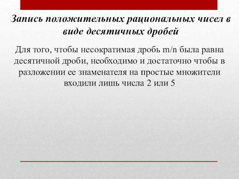 дробь m/n была равна десятичной дроби, необходимо и достаточно чтобы в разложении ее знаменателя на простые множители входили лишь числа 2 или 5