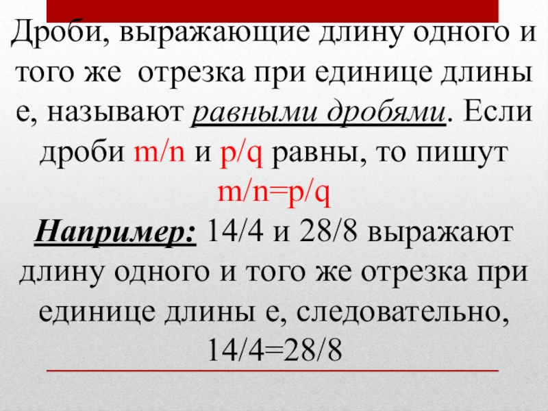 Например: 14/4 и 28/8 выражают длину одного и того же отрезка при единице длины е, следовательно, 14/4=28/8